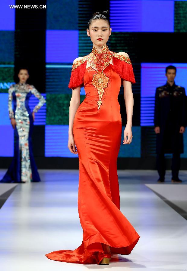 A model shows a creation of a Chinese designer during the 2014 ASEAN and Chinese Costume Culture Exhibition in Beijing, capital of China, April 8, 2014. (Xinhua/Chen Jianli) |