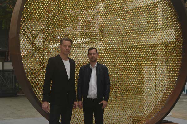 Swarovski installation with the artists Patrik Fredrikson (blonde one) and Ian Stallard.