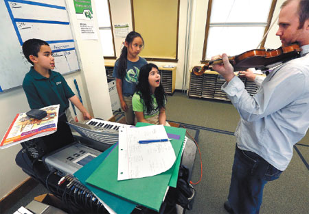 John Hilton, a violinist with the Colorado Symphony Orchestra and a teacher with the Very Young Composers program, helps students compose during music class at Cole Elementary in Denver.