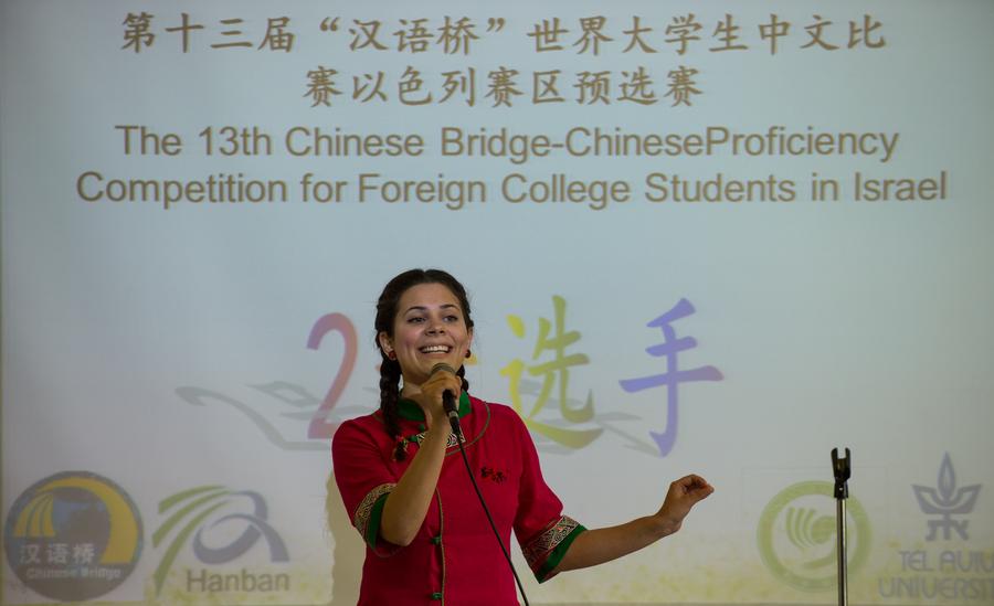 Miri Shlimak, student of Tel Aviv University, sings a song "Melody of Yimeng Mountain" during the 13th Chinese Bridge-Chinese Proficiency Competition for Foreign College Students in Israel at Tel Aviv University in Tel Aviv, Israel, on May 30, 2014. The competition attracted seven students from Tel Aviv University, the Hebrew University of Jerusalem and University of Haifa and Miri Shlimak won the first place on Friday.[Photo/Xinhua]
