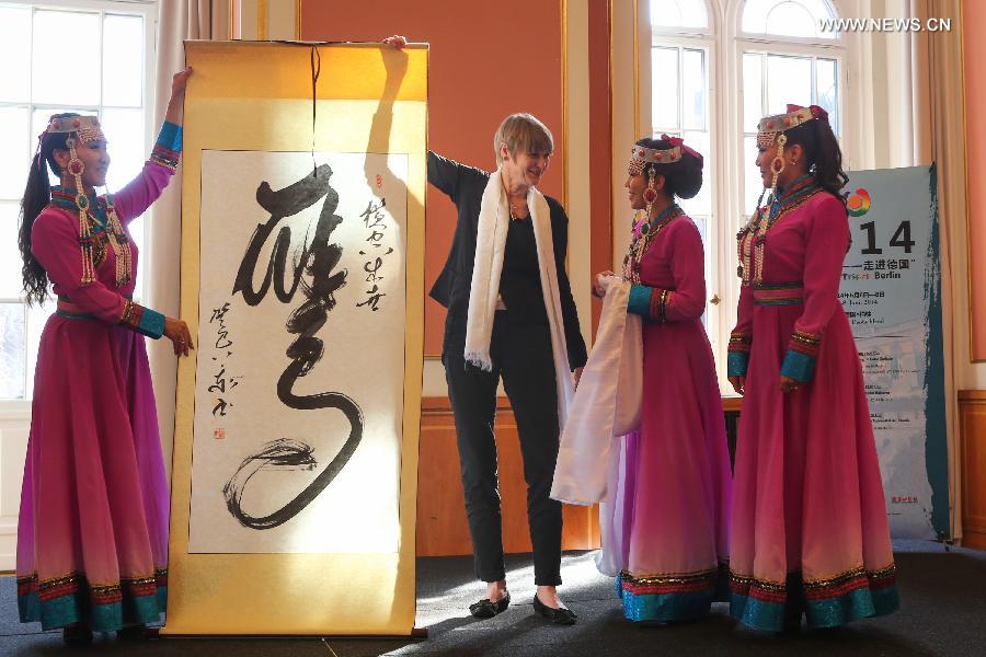 A representative from Berlin's government (2nd L) receives a calligraphy artwork as a present from Chinese performers during the opening ceremony of 2014 "China meets Berlin" Culture Festival at the city hall of Berlin, Germany, on June 6, 2014. (Xinhua/Zhang Fan)