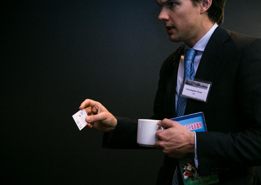Christopher Dean, the representative from BBC asks for information from Chinese representatives during the promotional event "Rediscover the Silk Road at Beautiful China" in New York, the United States, June 6, 2014. China National Tourism Administration with the Tourism Bureaus of 7 provinces along the Silk Road and other Chinese travel industry representations based in New York, hosted a promotional event "Rediscover the Silk Road at Beautiful China" in New York City on Thursday. (Xinhua/Liang Menglong)