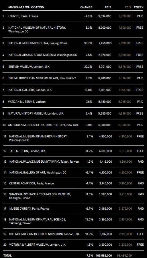 Ranking the 3rd, the National Museum of China with 7.5 million visitors, saw the biggest growth from 2012 among the top 20.
