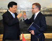 Chinese Premier Li Keqiang (R) presents the reproduction of a relic from China's Sanxingdui archaeological site as a gift to the Heraklion Museum in Heraklion, Crete, Greece, June 21, 2014. Li and his Greek counterpart Antonis Samaras (2nd L) attended the opening ceremony for the new hall of the Museum. (Xinhua/Wang Ye)