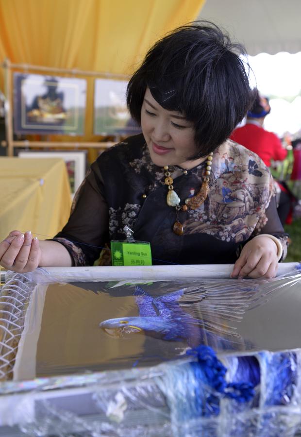 Sun Yanling from northeast China's Heilongjiang Province performs Mohe embroidery at the opening ceremony of 48th Smithsonian Folklife Festival in Washington D.C., the United States, on June 25, 2014. The 48th annual Smithsonian Folklife Festival opened in Washington on Wednesday with a major theme: "China: Tradition and the Art of Living".[Photo/Xinhua] |