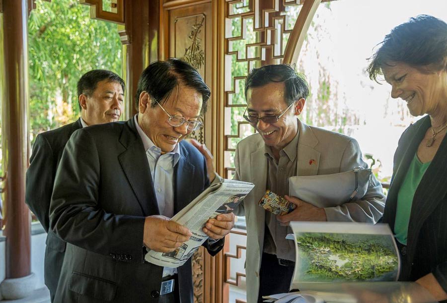 Cai Wu (second from left), China's Minister of Culture, visited the Chinese Garden at Huntington Library together with Che Zhaohe (second from right), cultural consul of Consulate General of China in Los Angeles, on Tuesday in San Marino, California. He was reading an article about T. June Li, curator of Chinese Garden, in the June 27 China Daily that he received from the library. He told Suzy Moser (right), assistant vice-president for advancement of Huntington Library, that he recognized the contribution the Huntington Library has made to bridge cultures between the US and China. [Photo / Provided to China Daily]