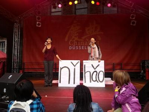 Teachers from the CI Düsseldorf observe the development process of pictographic Chinese characters on the main stage of the annual China festival.[www.baidu.com]