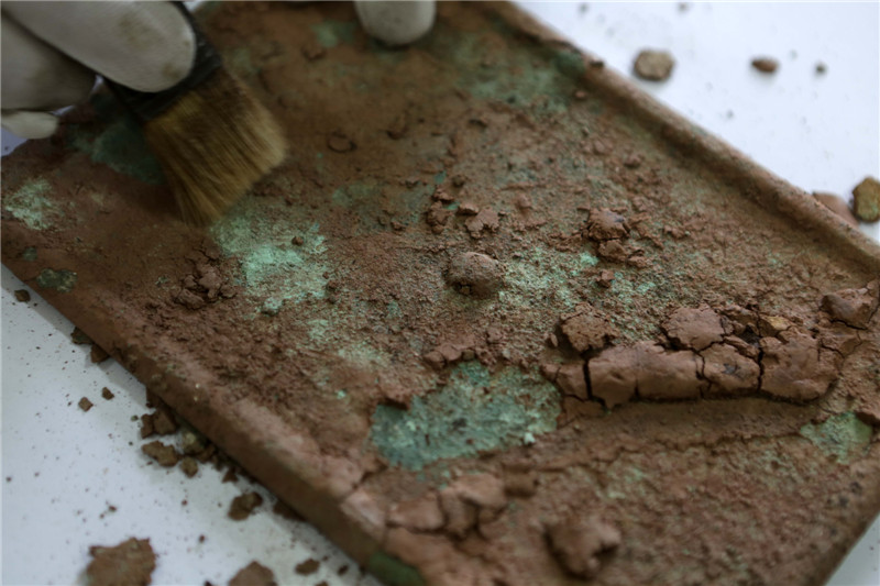 Researcher cleans up a bronze mirror unearthed from the tombs of Song Dynasty (960-1279) in Dazu district, Chongqing, on Aug 4, 2014. [Photo/Xinhua]