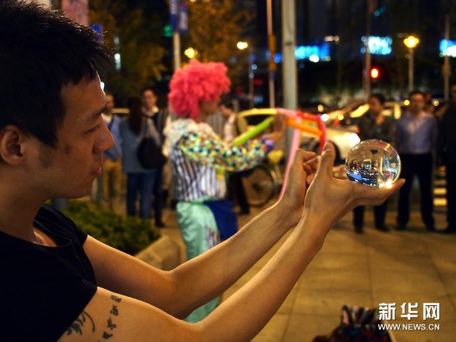 Lu Xinyi, a licensed street artist, performs with a crystal ball on a street in East China's Shanghai municipality on Oct. 28, 2014.[Photo/Xinhua]