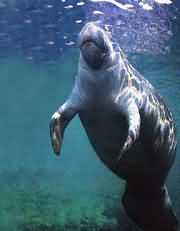 Its spindle-shaped body is about three meters in length and 300 to 500 kilograms in weight, with sparse and short body hair all over and no obvious neck. On the small head, the upper lip is in horse-hoof shape, the mouth end protrudes with setaceous, and the two circular-like breathing holes are arranged in parallel at the front of the vertex. Behind the eyes are ear holes without auricle outline. It has no dorsal fin but an oval fin limb, under which is a pair of breasts; the wide and large tail fin has two flatly symmetrical pieces, with posterior margin in furcation and no indention. Its back is mainly in mouse color, belly slightly pale.