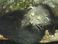 Binturong inhabits in tropical rain forests or monsoon forests. It is a typical tree dwelling animal; its aculeate claws and voluble tail, able to scratch and to reel, enable it to climb freely on high and huge trees. It moves about frequently in the morning and dusk, mainly feeding on fruits, bird ova, birdie, and mini-type animals. It can breed all the year round, often mate between February to March, and litter in the middle ten days of May, usually 2 to 3 babies per fetus. It has a lifespan of 15 years.