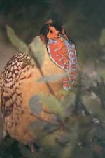 Its full-length is 46 to 61 centimeters. The male's upper body is mostly chestnut brown, with light yellow round spots of black brim, and the lower body is also light yellow. Its head is black with black and castaneous red crista. The rectrices are black and tan, densely covered with irregular yellow spots and wide black end strips. The ala tectices' color is like the back feather. Its remiges are brown, mixed with yellow spots. The naked skin on the check is vermeil and that on the larynx is turquoise blue and vermeil. Body feathers of the female are taupe, densely covered with black, tan stripes and white arrow-shaped lines.