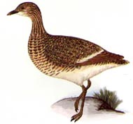 Its body length is about 41 centimeters with only three toes. The head feather of the male is tan with black spots, and its neck is black brown with white spots. It has brown upper back, white lower body and white spotted wings. Its rectrices are short and white, with brown end. Feathers of the female are similar to that of the male, but the back has large black spots.