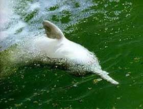 White-fin Dolphin is a mammal similar to dolphins, living in fresh water of rivers. Its body is in the shape of spindle. The skin of the whole body is bare and hairless, with long snout. The eyes are small and degenerated. Its sonar system is especially sensitive, able to detect and identify objects in water. Its back fin is in obtuse triangle, with fin limbs and tail fin all stretching in horizontal direction. It has steel gray back and white belly. The body color of the newborn dolphin is deeper than that of the adult. By far, the largest female individual ever found is 253 centimeters in length and 237 kilograms in weight, while the largest male individual is 216 centimeters in length, and 125 kilograms in weight.
