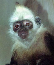 With the alias of Colored Leaf Monkey, it belongs to the Cercopithecidae family of Primates order. Its scientific name is Presbytis leucocephalus (Latin), or White-headed Leaf Monkey (English).