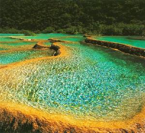 In the Reserve, there are many splendors like snow mountains, primitive forests, canyons and colorful lakes. Its most important feature is the outstanding karst formations. In a 7.5-kilometer-long valley in the shape of U set between high hills and snowy mountains, the travertine falls and limestone shoals run from an elevation of 3,578 meters down to 2,200 meters like a soaring yellow dragon called Huanglong in Chinese. In Huanglong, there are three temples: the front, middle and back, at an interval of 2,500 meters. All the three temples are called Huanglong Temples, hence the name of the Reserve.