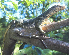 It is one of the largest lizards in China. It is nearly 2 meters long and its tail occupies three fifths of the entire length. There are small scales all over the body. It has a long head, strong limbs, and a long snout with nostril near the end. Its tail is as flat as a ribbon and its four limbs are stout. It has a rather long tongue with deep forfication at the front tip. The scales on tail back form two rows of protuberance. Its back is black mixed with yellow stripes. Its belly is light yellow or gray, decorated with a few black strips. Its tail has horizontal lines alternating in black and yellow.