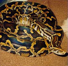 Python inhabits in the jungles of the tropical and subtropical zones. It is good at climbing but also able to dwell in water. It likes moonlighting. Various backboned animals are its food. It can swallow a calf of dozens of kilograms in weight. When catching food, it entangles its preys until they are suffocated to death. It spawns during April and Jun every year, laying 10 to 100 eggs each brood. The female python coil its body around the eggs for incubation.