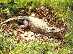 It digs caves on the banks of rivers, lakes and ponds as its living place. Being ferocious, it feeds on various beasts, birds, amphibian, reptiles, fishes and shellfishes. Its mating period is in June and oviposition period is between July and August, with more than 20 eggs each time. It lays eggs in grass and covers them with weeds. Female alligator guards and protects eggs on the side and hatches them with body temperature. The incubation period is about 60 days. It has the habit of hibernation.
