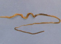 It is soft and slender with a full length of 300 millimeters, in the shape of a worm. Its snout section is in the shape of oblate cone, with a strip of apparent or unapparent longitudinal groove in the centre line of both sides. From base to tip, the snout is separated by the groove into two parts -- the left and the right. Its collar section is wide and short, with a strip of ring-shaped dent in the lower part, of which the surface is smooth and the length is only 1/100 of full length. Both snout and collar sections are in the color of light orange. Its tail, in the shape of cylinder, is in the color of greenish yellow except for the yellow tail end.