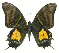 Its expansus is about 11 centimeters long. Similar to triangle, its black primary wing is covered by bright green and yellow scales with different density. The discal cell of hind wing has a piece of inaurate large blotch, with a crescent light yellow spot respectively on the RsM1 of the exterior margin and between the M1 - M2 veins. M3 vein extends to be a caudal appendage with yellow tip. The color and luster of stripes on the back of wings is lighter than that on the surface of wings. The inaurate large blotch on hind wings of the female almost occupies 3/5 of hind wings. There are 5 caudal appendages with various lengths on the hind wings.