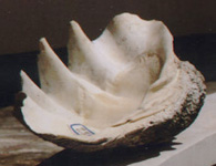 It has two massive shells slightly similar to triangle, which are equal in size but asymmetric. The forepart of shell is relatively short and there is a byssus aperture in the front of umbo. The larvahas a strong protruded byssus in the concave part of the front of umbo, but when grown up, the byssal aperture is closed. Its external ligament is narrow and long -- almost as long as the rear end of shell, and in the color of chocolate brown. Its dorsal edge is flat and ventral edge has corrugation. The two shells cannot be closed utterly. The surface of shell is white, with 5 strips of powerful imbricate tierceron ribs. Its growth ring is obvious, forming overlapped curving goffers on the shell surface. The inside shell is white and lustrous. There is a inter-rib groove in the opposite position of tierceron. The two shells, respectively with a main tooth and a posterior lateral tooth, have a narrow and long junction. The front closing muscle has vanished while the rear closing muscle is developed.