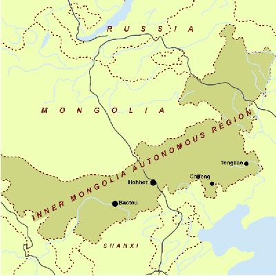 The Inner Mongolia Autonomous Region is situated 97"12"-126"04" east longitude and 37"24"-53"23" north latitude with an area of 1.183 million square kilometers, taking up 1/8 of that of the country and ranking the 3rd in China. Inner Mongolia has not only a large area but also geographical advantages, bordering Heilongjiang, Liaoning, Jilin, Hebei, Shanxi, Shaanxi, and Gansu provinces as well as Ningxia Hui Autonomous Region in the east, south and west. It spans the northeast, north and northwest of China and borders Russia and Mongolia in the north with a boundary line as long as 4,221 kilometers, thus becoming am important frontier for China's opening to the outside world.