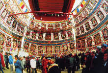 Because of boasting two monasteries, the village is divided into Upper and Lower Wutun. Living within the two monasteries are about 50 famous thangka artists. The two villages are full of monks and laypeople turning out masses of Buddhist art for monasteries as far away as western Tibet. The monastery in Upper Wutun, or Sengeshong Yago in Tibetan, is magnificently decorated, and the surface of the entire assembly hall has been carved and painted with traditional Regong designs.