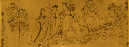 Wu's character was unrestrained, direct and indifferent to trivial matters. It is known that he always drank when painting. There are many stories about him and his paintings. It is said that when he drew the halo surround the Buddha's head for a mural, he used only his brushes without drafting the measurements first and that, when he went to the Long xingTemple to paint, the temple was packed with people. Wu moved his brush quickly when he painted and most of his works were accomplished in a single session. Chang'an (present-dayXi'an), capital of the Tang Dynasty, was the cultural center at that time, and many famous men of letters and artists lived there. Wu Daozi had many opportunities to stay with them, which helped him improve his painting skills. Once he met his calligraphy teacher, Zhang Xu, and a general inLuoyang. The general practiced fencing with quick movements and much skill. Inspired by him, Wu drew an extempore mural on the wall of the Tiangong Temple. He painted so quickly that his brush seemed to fly, and the sound of the moving brushstroke could be heard. After Wu finished his painting, Zhang Xu also wrote calligraphy on the wall. Those present were amazed, because they received the rare opportunity of seeing three great talents in one day.