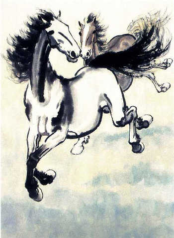 His works have impeccable composition, extensive scenes and rich characterization to reflect the themes. His paintings of animals, flowers and birds, such asCrowing Cock in StormandGalloping Horses, all reflect positive ideas. His works reveal his concern about society and the people and his devotion to art. Xu Beihong had researched the body shape and characteristics of horses and drew sketches of thousands of horses. The horses under his painting brush combine Western and traditional Chinese painting skills and have a uniqueattraction.