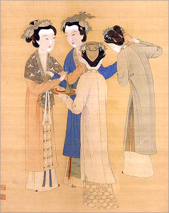 In the Ming Dynasty (1368 - 1644), there was an enormous development in the artists' portrayal of women. . Women's figures gradually started to have a certain aestheticism and symmetrical stature. Through solemn, simple and beautiful features the artists revealed their elegant manner.