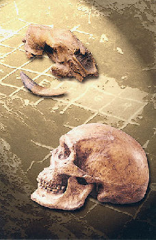 Fossil skull of sabre-toothed tiger: (up); Fossil canine tooth of sabre-toothed tiger: (mid); Fossil cranium of the Upper Cave Man: (bottom, cranial capacity is around 1300 ml-1500 ml) |