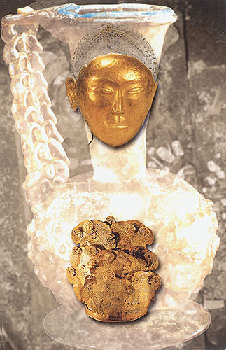 Each corpse was encased in a silver-wire mesh body suit that extended from the head to the toe. A gold death mask, an ornate headdress, earrings, a belt with gilded mounts hung with necessary accessories, and gilded-silver boots completed each outfit, along with clothing made of real fabric that had long ago disintegrated. Spare belts and other luxury items were scattered around their heads.
