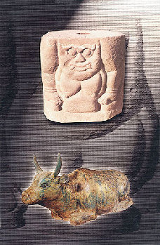 Statue of human: pedestal of stele (up, height 60 cm); Bronze ox: burial accessory (bottom, length 120 cm) |