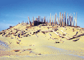 The exterior of the tomb site is an oblong sand dune; more than 30 well-preserved mummies have been excavated from inside the dune. The mummies' well-preserved state is due to them being kept air-tightened in ox-hide bags before they were interred. Tall timbers symbolizing the reproductive organs of males and females stand atop the sand dune and are the cultural traces of the people in Lop Nor area millenniums ago.