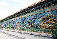 The most exquisite of all ancient screen walls are the three "nine-dragon walls" constructed of glazed colored tiles. The largest of these, 45.5m by 8m by 2.02m, is now in Datong, Shanxi Province. It originally stood in front of the princely mansion of the 13th son of Zhu Yuanzhang, the first emperor of the Ming Dynasty (1368-1644). Sculpted in seven different colors are nine dragons in the clouds. The most splendid of the three is the one belonging to a palace of the Ming Dynasty, which now stands north of the lake in Beijing's Beihai Park. It is a mosaic of glazed colored tiles displaying a relief of nine coiled dragons on each side. One can count the 635 smaller dragons along the ridges and roof tiles of the wall. The third wall stands opposite of the Huangjimen Gate in the Forbidden City; it is very well known to sightseers. All of the three walls were built during the Ming Dynasty and used to stand in front of the entrance to a courtyard - becoming an integral part of the architectural complex and adding to the magnificence of the buildings.