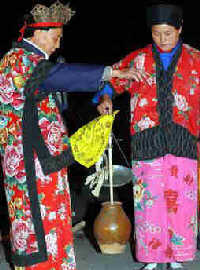 The ritual procedure includes inviting, welcoming and thanking spirits. Following the solemn ritual, nuo drama is performed to entertain the spirits.
