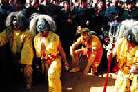 "Seizing the Yellow Devil" is a nuo dance drama from Wu'an County in Handancity, Hebei Province. The people of Guyi village in Wu'an perform the dance drama during the Lantern Festival(the 15th day of the first lunar month each year). They build temporary archways and stages throughout the village, injecting a festive atmosphere to the small region. The performance begins with several scouts riding on horseback along the village streets. A procession of 100 people holding flags and banners and beating gongs then follows the horsemen around the village to seize the "Yellow Devil." Again and again, guns are fired to announce the coming of the procession. The night before the performance, the Yellow Devil, which is acted out by a veteran of the art, begins to "haunt" the village, and the villagers carry weapons, such as sticks and knives, to chase the devil until it is caught the following morning. The Yellow Devil is then shackled and led by the "Elder Spirit" and the "Younger Spirit" to parade in the streets. After a trial, conducted by the "King of Hell" and "Justice Official of Hell," the Yellow Devil is sentenced to death and "executed" at noon.