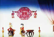 Puppet-show stage sets differ according to the type of puppets being used. String-puppet shows are mostly performed in the open air without a curtain to conceal the puppeteers and spectators can see the performances from three sides of the stage. Stages for glove-puppet shows are often examples of fine workmanship. Essentially, they are miniature palace courtyards with richly decorated buildings featuring carved rafters and golden roofs.