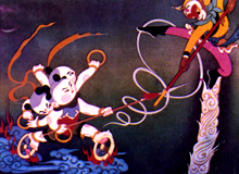 This is an episode from the classic Chinese mythical novel "Journey to the West." Though Sun Wukong (Monkey King) boasted supernatural powers, he was fooled into coming up to heaven by the Great White Planet. TheJade Emperorconferred upon him the title of Protector of the Horses. When Sun Wukong realized that his job was to look after the horses, he became so angry that he returned to his Mountain of Flowers and Fruit. Upon returning, he put up a sign, which declared himself as "the Great Sage Equaling Heaven." TheJadeEmperor swiftly ordered two heavenly generals to command some heavenly troops to capture Sun Wukong. Li Jing and Ne Zha served as the commanders of the heavenly troops. When they arrived at the Mountain of Flowers and Fruit, they ordered the Mighty Magic Spirit to challenge Sun Wukong. Great Sage Sun then asked the Mighty Magic Spirit to forward his message to the Jade Emperor that if he was conferred the title of "the Great Sage Equaling Heaven," he would refrain from attacking the Heavenly Palace of the Jade Emperor. The Jade Emperor was furious and sent generals and troops to catch Sun Wukong. But they were defeated, so the Jade Emperor was thus forced to confer the title of "the Great Sage Equaling Heaven" upon Sun Wukong.