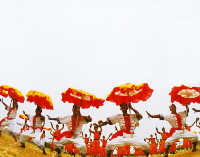 Farmer's Dance, popular in the congregating area of the Korean ethnic group in the northeastern China, is a representative dance favoured by these people. It is characterized by "beating tambourine" and "swingingelephant cap". The movements of tambourine beaters are rich and vigorous and posing like horse riders and arrow shooters while the elephant cap swingers use their necks as axles just to swing the 12-metre long tape tied to the cap, which move like wheels round the dancers and dazzle the viewers. The dancers usually consists of about 60 people, and hold a banner with the characters reading as "Agriculture is the basis of the whole world", which tells the aim of this particular dance as paying much attention to the agriculture as well as entertaining the farmers.