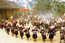 Cap Dance, popular in the Jinghong County of Xishuangbanna Region inYunnan Province, is a festival dance of the Aini People (of the Hani ethnic group) in the occasions of the Swing Festival, Bamboo Shoot Fair, Rice Seed Festival. While dancing together, men and women form a circle and there is no limit to their number. Men play music to help women change the floor patterns while the latter moving as the major dancers with uniquely shaped caps in their hands, forwards and sidewise, even over-headedly, and always abruptly and their knees shivering slightly, which makes the whole dance natural and stylish, easy-going and lively.