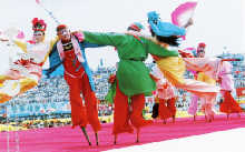 Stilt Yangge is widely popular in northern China while one kind of which spreading in the southernLiaoning Provinceproves to be one of the best Chinese folk dances. The ballad can give us an idea on how the local people love it: "People would itch to dance on hearing the trumpet blowing while they jump high on hearing the drums and gongs."