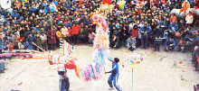 Waking Lion dance is characterized by its unique and vivid expression, of which the most attractive part is the lion "picking up vegetables", that is, the vegetables and monetary reward called "red package" are bound together, and either put. on the ground or hanged in the air, just to invite the lion dancer to pick them up by overcoming all kinds of obstacles and provide him with a chance to exhibit his wisdom and skills. Though it is not easy to accomplish, the clever dancer is always enough to make it and arouse deafening cheers and applause from his audience.