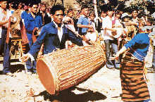 Waterdrum Dance is popular mainly in the villages of De'ang ethnic group and the Dai people in Bawanxiang of Baoshan City in Yunnnan Province. It is performed at religious gatherings or festival celebrations by the masses of both peoples either on the squares of the Buddisttemples, or in their villages. It is extremely busy and exciting with the water drums, the elephant-foot-shaped drums, the cymbals and Mang gongs of different sizes beaten gloriously. The movements of the dancers are calm and unhurried because of the heavy weight of the waterdrums which gradually becomes a style of its own.