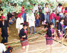 Cutting Firewood Dance is also called "Jumping over Bamboo Poles" and widely popular in the congregating area of the Li ethnic group of Hainna Province. The bamboo pole holders move these poles in different directions just to examine the flexibility and nimbleness of the jumpers. This dance is fairly interesting and quite popular with the local people.