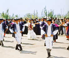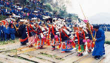 In performing this dance, the male dancer in rich and constantly changing movements with his torso swinging to his own paces while his legs respectively half-squatting and sidewise stretching which twist the torso naturally. The females dance with handkerchiefs swinging in theirhands, dresses swinging, and silver decorations on their dresses ringing, which display the special charm of women of the Miao ethnic group.