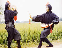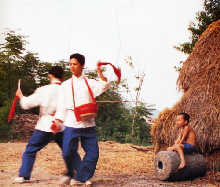 The dance is performed by farmers knowing some marital arts with witty and funny styles and some imitation. For example, when performing "a serpent spit an arrow", one dancer would quickly thrust a drum club at the eyes of the other dancer, which stands for the action of "spitting an arrow"; when performing "a lazy cat washes its face", the dancers would imitate the movements of cat washing its face. It is very popular because its performance is vehement and easy to learn.