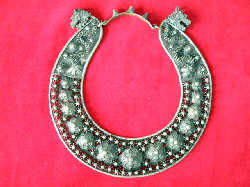 A popular silver chest decoration, the bands are usually rectangular or semicircular and evolved from longevity locks . Some smaller ones are made of single pieces, and bigger ones are made up of two or three pieces, covering almost the whole chest and abdomen with a highly decorative effect.