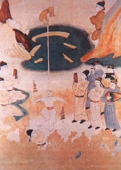Pole Balancing with Young Boy Doing Stunts, a Song Dynasty mural in Dunhuang County, Gansu Province |